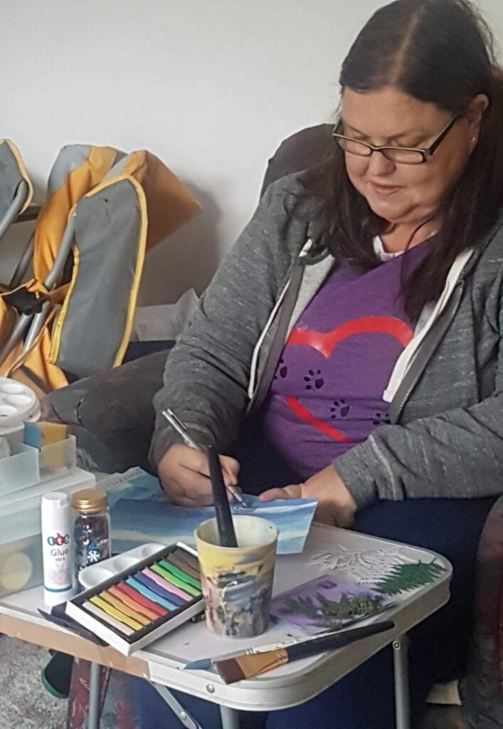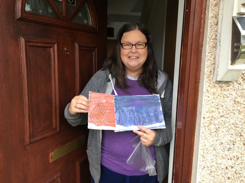 Volunteers are moving their fundraising efforts online – with support from artist Tracy Gorman, volunteers have been learning new skills to design cards, artworks and products which are now available to buy from our Etsy shop. Tracy has recorded tutorial videos which have introduced new creative techniques to volunteers; they are then supported through weekly workshops on zoom to consolidate all the new skills they have learned. Volunteers can re-watch the videos in their own time and share their progress to a private photo-sharing app called Cluster where they can access guidance from tutors and offer advice to each other as their skills develop. As volunteers have built up their skills and knowledge during this process, they have created their own skill-sharing videos and supported participants on other therapeutic programmes through peer support and zoom workshops. Volunteers have also been helping to photograph products and assist with the general management of the Etsy shop.
